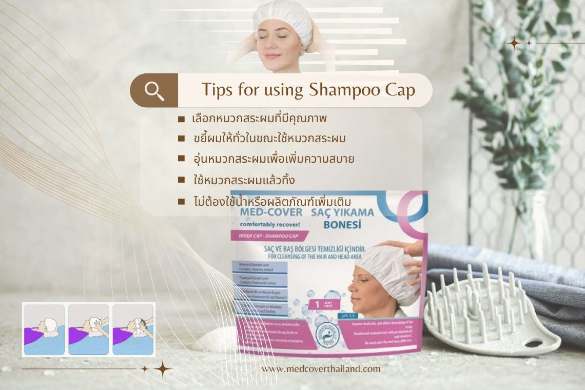หมวกสระผม เป็นอุปกรณ์ที่ออกแบบมาให้ใช้งานง่าย เพียงแค่สวมหมวกลงบนศีรษะแล้วขยี้เบาๆ เพียงเท่านี้ก็สามารถทำความสะอาดเส้นผมได้ทันที โดยไม่ต้องใช้น้ำหรือแชมพูเพิ่มเติม เนื่องจากหมวกมีสารทำความสะอาดแชมพูและครีมนวดผมอยู่ภายในซึ่งจะช่วยทำให้เส้นผมสะอาดและนุ่มลื่น แถมยังสะดวกและปลอดภัย โดยไม่ต้องกังวลเกี่ยวกับการใช้น้ำที่อาจทำให้เกิดการติดเชื้อในผู้ป่วยติดเตียงหรือผู้ที่มีปัญหาในการเคลื่อนไหว