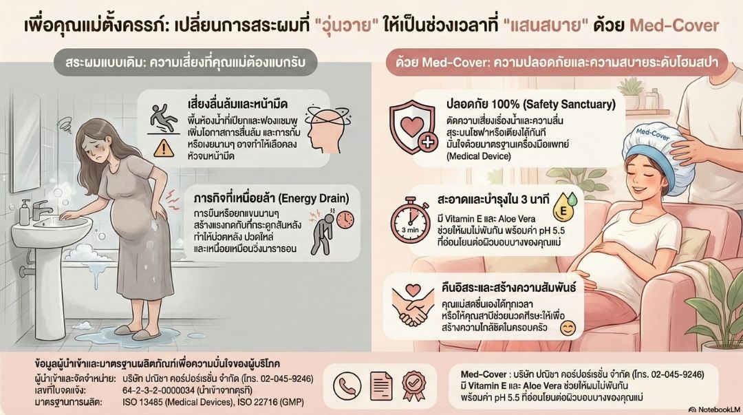 ในเชิงการแพทย์ การลดความเสี่ยงจากอุบัติเหตุในชีวิตประจำวันถือเป็นส่วนหนึ่งของการป้องกันภาวะแทรกซ้อนระหว่างตั้งครรภ์ Med‑Cover Shampoo Cap ถูกออกแบบมาเพื่อช่วยให้คุณแม่สามารถดูแลสุขอนามัยได้ โดยไม่ต้องเผชิญความเสี่ยงจากการลื่นล้มหรือการเปลี่ยนท่าทางอย่างรวดเร็ว Med‑Cover Shampoo Cap คือหมวกสระผมแบบไม่ต้องใช้น้ำ ไม่ต้องลุกเดินเข้าห้องน้ำ ไม่ต้องก้มศีรษะ เหมาะอย่างยิ่งสำหรับคุณแม่ตั้งครรภ์ที่ต้องการลดความเสี่ยงจากการลื่นล้ม