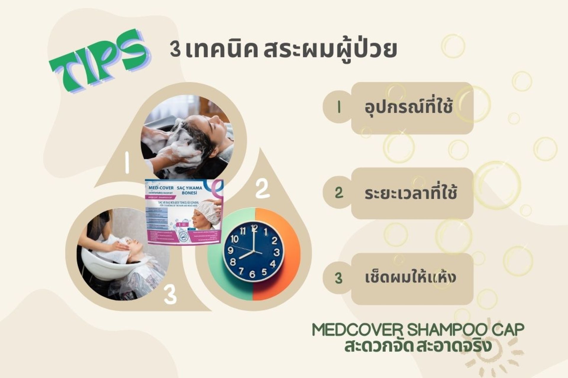 การสระผมผู้ป่วยถือว่าเป็นเรื่องที่จำเป็นแต่หลายคนก็แอบกังวลถึงความยุ่งยากวุ่นนวายและอุปกรณ์เสริมมากมาย เพื่อให้คนป่วยสามารถสระผมได้แม้ในขณะนอนบนเตียงได้.....นวัตกรรมการดูแลผู้ป่วยได้ถูกคิดค้นและพัฒนามาอย่างต่อเนื่อง หมวกสระผม MEDCOVER SHAMPOO CAP จึงเป็นอุปกรณ์ที่ตอบโจทย์การดูแลสุขภาพผมผู้ป่วยได้อย่างมีประมิทธิภาพ ด้วยความสะดวกสะอาด ปลอดภัยที่เหนือการสระผมด้วยน้ำและแชมพูแบบปกติ
