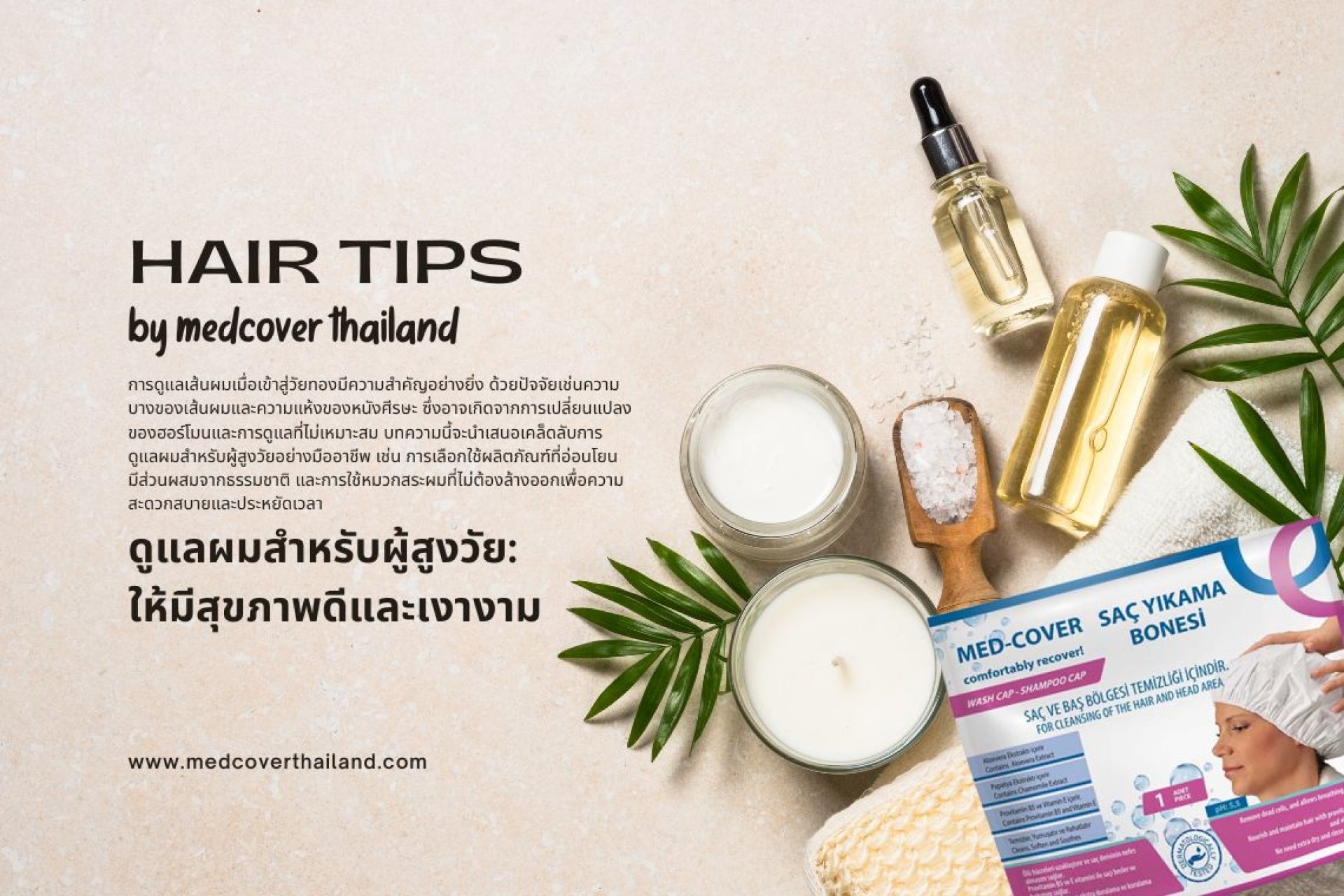 บทความนี้จะครอบคลุมข้อมูลเกี่ยวกับวิธีการดูแลเส้นผมและหนังศีรษะของผู้สูงวัยอย่างละเอียด เช่น การเลือกแชมพูและครีมนวดที่เหมาะสม การดูแลปัญหาผมบาง และการปรับเปลี่ยนการดูแลผมให้เหมาะสมกับสภาพอากาศและการเปลี่ยนแปลงของร่างกาย นอกจากนี้จะมีการแนะนำผลิตภัณฑ์ Med-Cover Shampoo Cap ที่มีส่วนผสมอ่อนโยน เช่น วิตามิน E และสารสกัดจากพืช ที่ช่วยบำรุงและปกป้องหนังศีรษะ